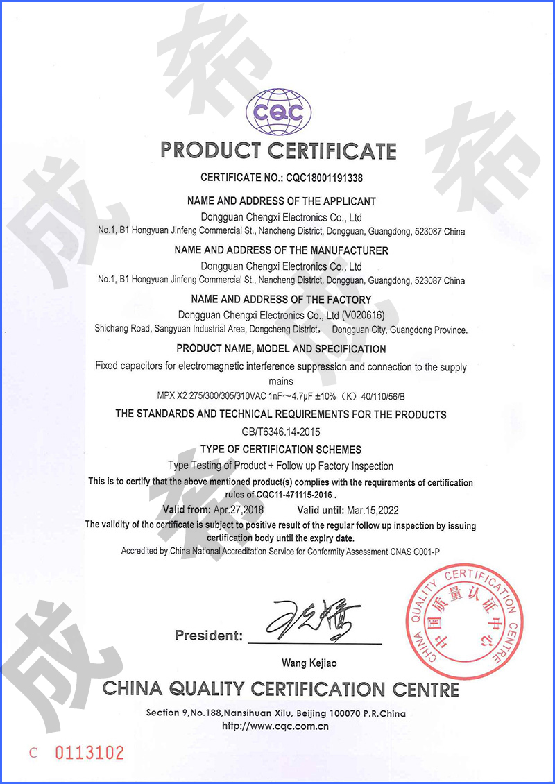 公司通過ISO9001:2015質量管理體系;ISO14001:2015環保管理認證.安規X、Y電容、壓敏電阻通過CQC、UL/CUL、TUV、ENEC等安全認證,產品符合RoHS、REACH、HF環保認證。